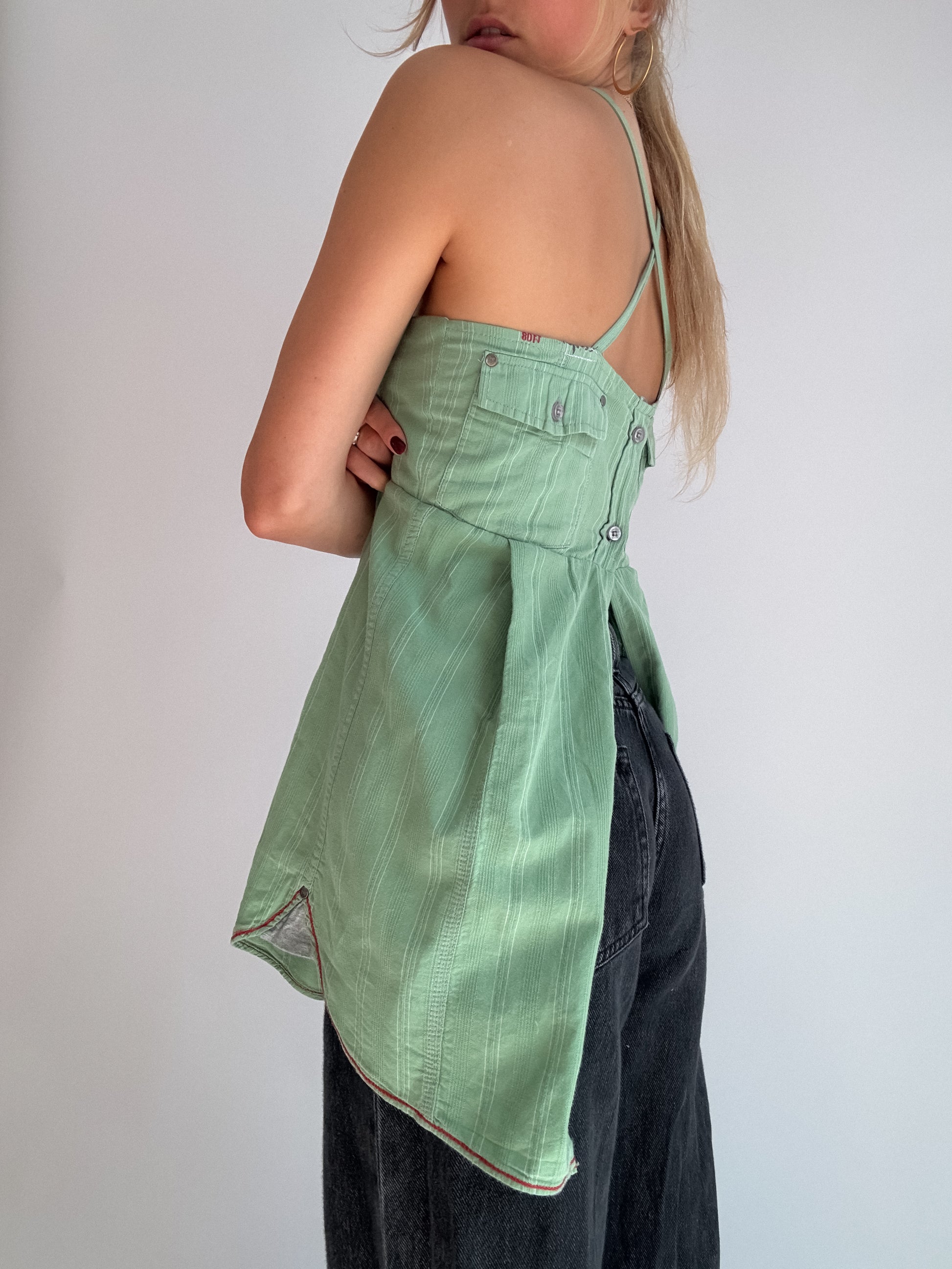 Top à fines bretelles, upcyclé à partir de la chemise de ton ex que t'as gardée en douce... Boutonnière de chemise et détails d'upcycling uniques.