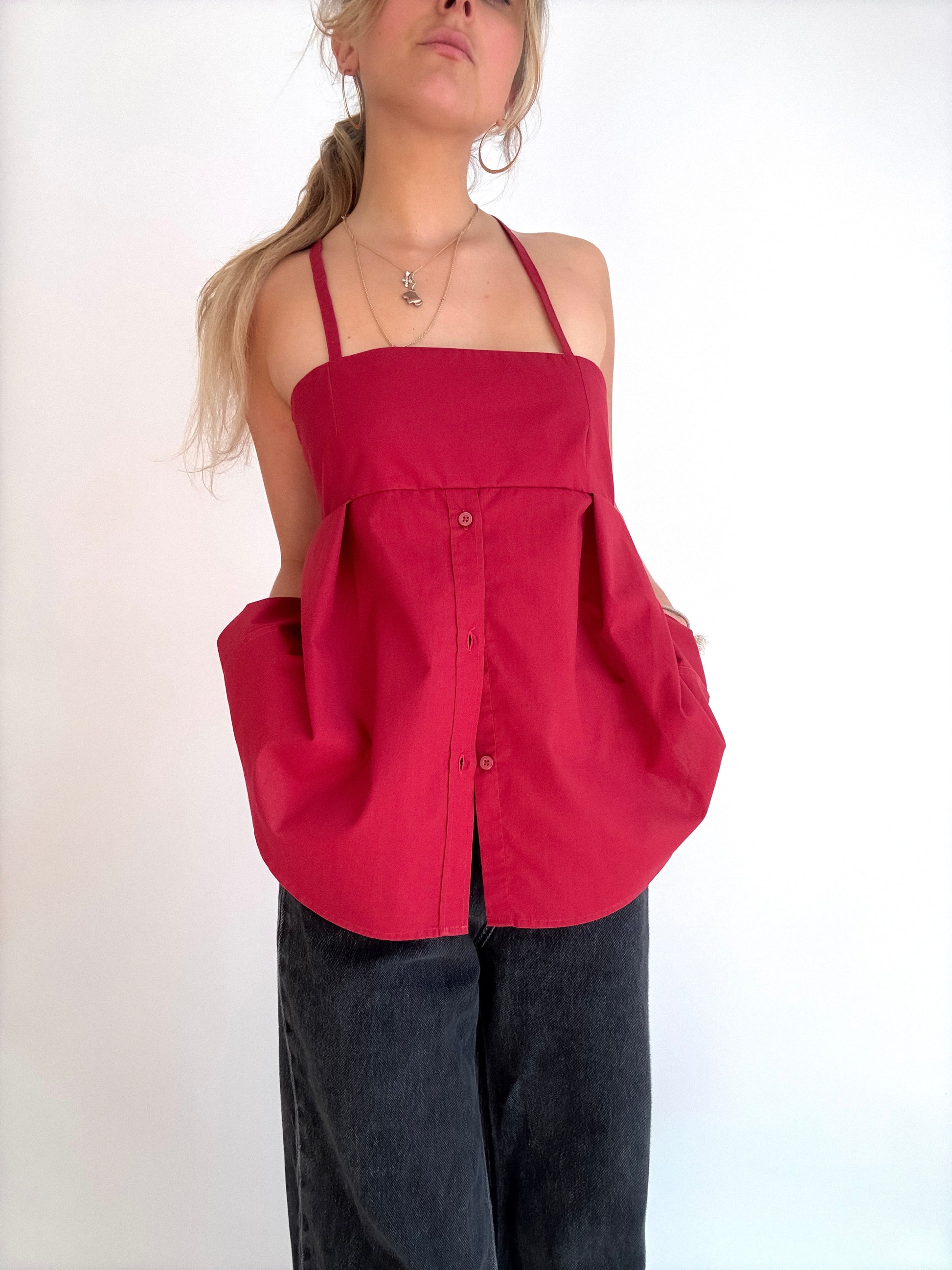 Top à fines bretelles, upcyclé à partir de la chemise de ton ex que t'as gardée en douce... Boutonnière de chemise et détails d'upcycling uniques.