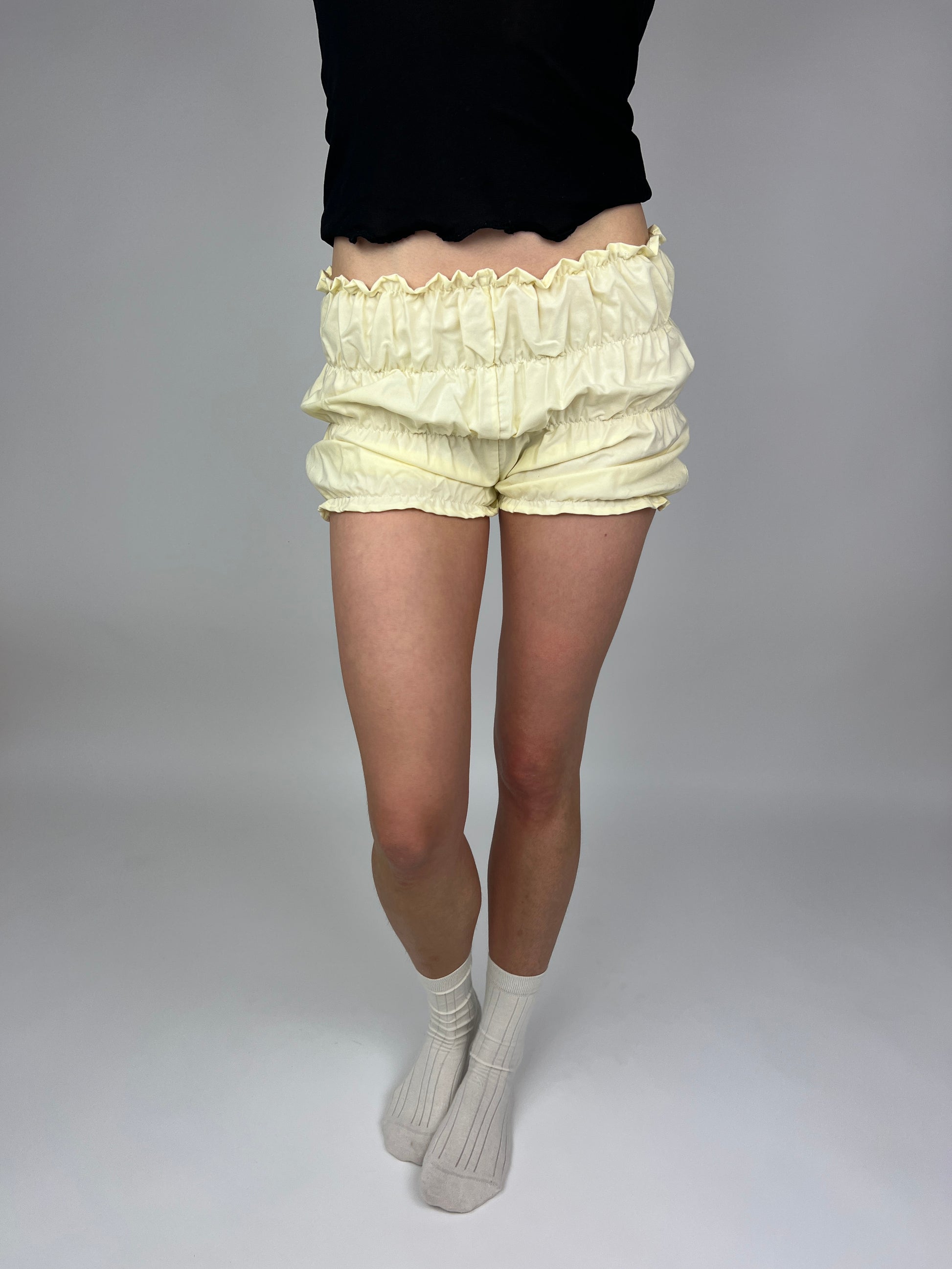 Shorty à fronces, upcyclé à partir d'une chemise pour homme. Pièce unique avec des touches d'upcycling uniques.
